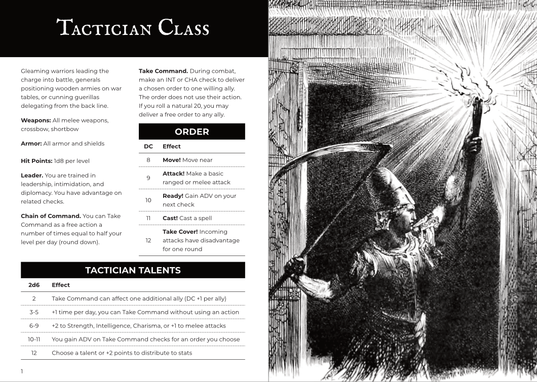 - Removed "Leadership Style". This didn't make much sense, as any Tactician is likely to use the higher attribute between CHA or INT anyway. I've modified this to "Leadership," which just provides training in certain areas like other Shadowdark classes (e.g. Bard and Thief). Take Command now states that you can use CHA or INT with it.